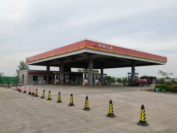加油站設置汽油卸油和加油油氣回收系統。加油區設置加油罩棚,罩棚為鋼結構罩棚。罩棚下設置4臺雙油品雙槍潛油泵型加油機、4臺單油品雙槍潛油泵型加油機;埋地罐區(非車道罐)設有5只SF (內鋼-外玻璃纖維增強塑料)油罐,分別為2只30m³92#汽油罐、1只30m³95#汽油罐、2只30m³0#柴油罐,油罐總容積折算為120m³(柴油罐折半計入),根據《汽車加油加氣加氫站技術標準》GB50156-2021的相關規定,該加油站為二級加油站。